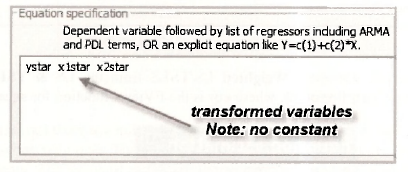 To obtain the generalized least squares estimates in equation (8.27) on page 207 of the text we can use EViews weighted least squares option, with weighting series σ-1 = 1/SIGHAT. The Equation specification and LS & TSLS options are given by