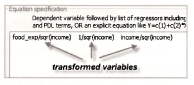 An alternative way that avoids the need to define new series is to transform the variables within the Equation specification, as illustrated below. Try it. Check your output.