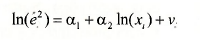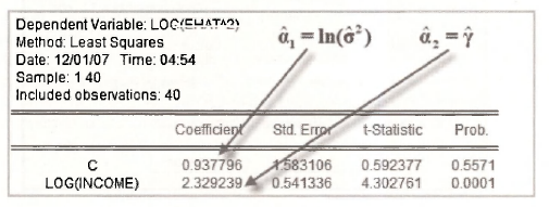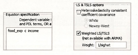 where ei are the least squares residuals, a, = ln(σ2) and a2 -y . Recognizing that the ei, were previously saved in the workfile food.wfl under the name EH AT, and that xi – INCOME, least squares estimates for a1 and a2 are obtained using the following Equation specification.