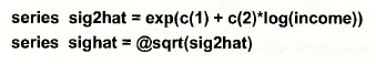 To proceed to generalized least squares estimation we need the exponential of the predictions from this equation, σ2i =exp(a1 + a2 In(INCOMEi)) or their square roots σi . It is instructive to consider two ways of computing them. The first is using the commands