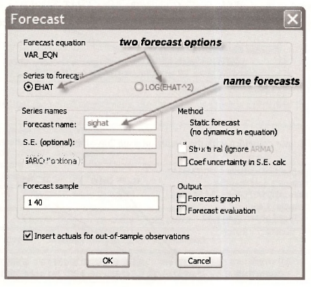 An alternative way of obtaining ct; = sighat is to use the forecast option. In the window displaying the output from estimating the variance equation, click on [Forecast], in the resulting forecast window, you will see two possible series that can be forecast, EHAT and LOG(EHATˆ2). This choice has arisen because the dependent variable in the Equation specification was written as log(e2), a transformation of the series e . EViews is giving you the option of forecasting the original series e or its transformed version log(e2). If you had defined the dependent variable as q = log(e2) via a series command, and then specified your dependent variable as q, EViews would not have been given you a choice. It would assume you want to forecast q. Writing the transformation as part of the equation specification is what leads to the choice.