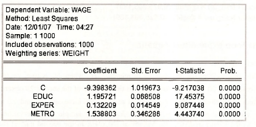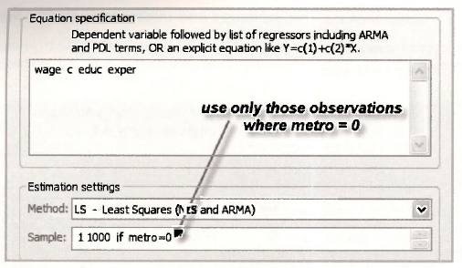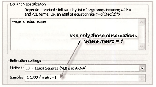 This instruction tells EViews to consider all 1000 observations, but to restrict estimation to those where metro = 1.