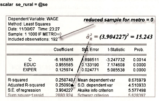 The results below show that there are 192 rural observations. The standard deviation and variance of the error term are, respectively, σR = 3.904 and σ2R = 15.243 . We save the value for aK using the command