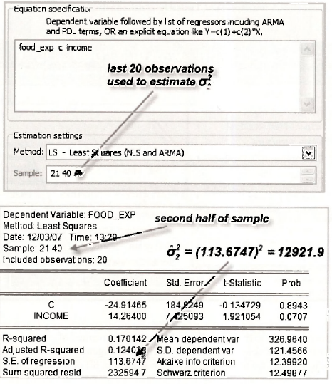 For the food expenditure example there are no two well defined sub-samples for σ21 and σ22. For convenience, and to improve our chances of rejecting H0 when H1 is true, we take af as the variance for the first 20 observations and at as the variance of the second 20 observations. Since our alternative hypothesis is that σ22 increases as INCOME increases, σ21 and σ22 are not actual variances, but devices to aid the testing procedure. In our sample the observations are ordered according to the values of INCOME. Values of INCOME in the second half of the sample are larger than those in the first half of the sample. Thus, a, will tend to be greater than σ22 when H1 is true, but similar when H0 is true. If your data are not ordered according to increasing values of INCOME, you can reorder them using the command