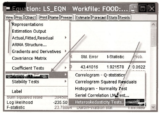 where e2 are the squared least-squares residuals and z2,z3,…,zs are the variance equation regressors. EViews has the capability to automatically compute test statistic values for these tests as well as their corresponding /7-values. To locate this facility open the least-squares estimated equation and then select View/Residual Tests/Heteroskedasticity Tests.