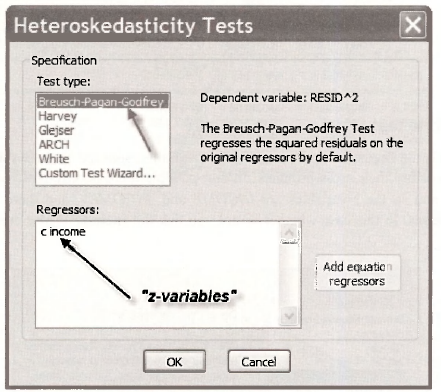 The Breusch-Pagan test (also called Breusch-Pagan-Godfrey test to recognize that Godfrey independently derived the test at about the same time as Breusch and Pagan) can be selected from the Heteroskedasticity Tests dialog box as indicated below. You have the option of selecting the “z-variables”. If you do nothing, EViews will automatically insert those in the mean regression equation. For future reference, inserting INCOME and INCOME2 leads to the White test example of the next section.