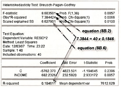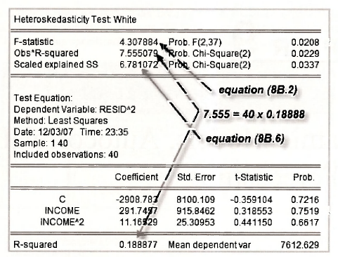 After selecting White and clicking OK, the output below appears. The value of the chi-square statistic considered in the text is x = N x R2 = 40 x 0.18888 = 7.555 . Its corresponding p-value is 0.0229, leading to rejection of H0 at a 5% significance level. Can you see where these values can be located on the output? The values for the other two tests statistics on this output come from equations (8B.2) and (8B.6) in Appendix 8B. After a little detective work, you will discover they are calculated as