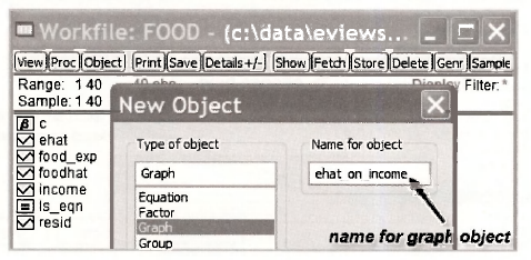 Returning to our task of graphing the residuals, we create a graph object by going to Object/ New Object and selecting Graph. As a name for the graph, we chose EHAT_ON_INCOME.
