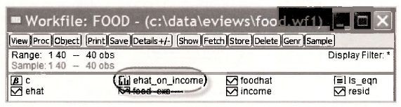 Another way to illustrate the dependence of the magnitude of the residuals on INCOME is to plot FOOD EXP and the least-squares estimated line against INCOME, as is displayed in Figure 8.2 on page 200 of the text. To reproduce this figure, select Object/New Object/Graph and give the graph a name, say FIGURE 8 2.