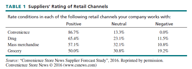 Stacking up the convenience channel against the other retail channels they serve, c-store suppliers and wholesalers gave convenience high marks for performance. A whopping 86.7 percent of respondents placed convenience in the positive column when asked to rate conditions in the retail channels where they work. This rating placed convenience squarely in front of all competing channels, with drugstores coming in second at a 65.4-percent positive rating. See Table 1.
