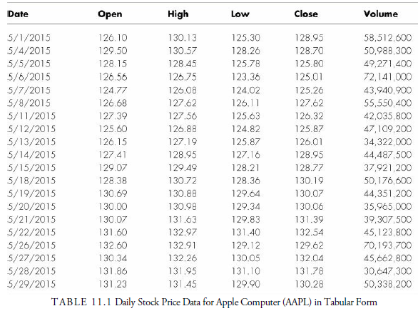 For example, look at Table 11.1. This table contains the daily reported prices for Apple Computer (AAPL) for the month of May 2015.
