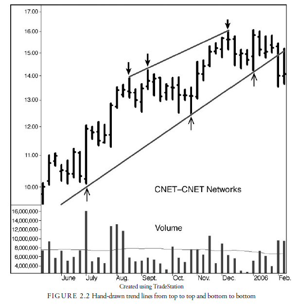 Another method of identifying trends is to look at a graph of prices for extreme points, tops, and bottoms, separated by reasonable time periods, and to draw lines between these extreme points (see Figure 2.2). These lines are called trend lines. This traditional method is an outgrowth of the time before computer graphics software when trend lines were hand drawn. It still works, however. Using this method to define trends, you must define reversal points. Chapter 12, “Trends—The Basics,” covers several methods of determining reversal points, but most such points are obvious on a graph of prices. By drawing lines between them, top to top and bottom to bottom, we get a “feeling” of price direction and limits. We also get a “feeling” of slope, or the rate of change in prices. Trend lines can define limits to price action, which, if broken, can warn that the trend might be changing.