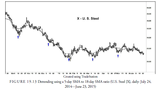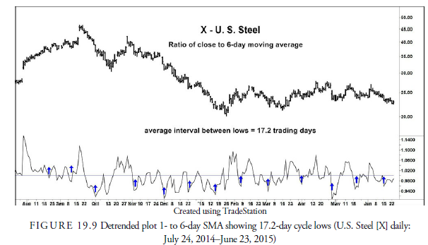 As a further example, Figure 19.9 shows detrending using a six-day SMA, roughly half the length of the SMA used in Figure 19.8. The plot in Figure 19.9 shows more clearly the cycle lows 17.2 days apart, the halfcycle of the 34-day cycle shown in Figure 19.8.