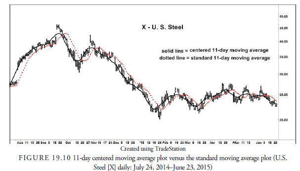 Notice in Figure 19.10 that the centered moving average better reflects the price action than the conventional plot. It runs through the center of all the price oscillations and is not skewed to the right of prices, as is the conventional method. The problem of skewing to the right becomes even more noticeable as the moving average span increases. The centered moving average plot is a better representation of prices but, of course, lags behind prices and by itself cannot be used as a signaling method. It is used to identify cycles but not to predict them.