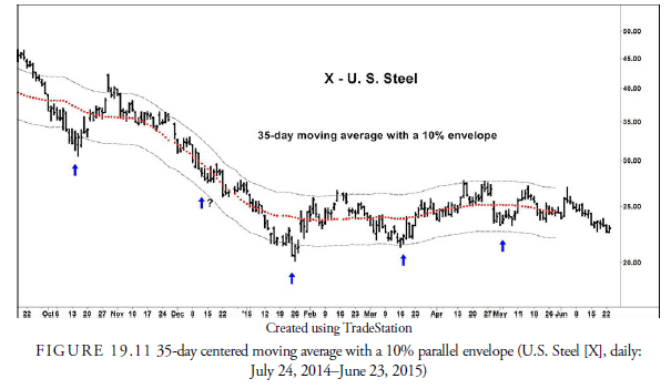Moving averages dampen or smooth data. In terms of cycles, a moving average represents price oscillations greater than the period of the moving average and effectively cancels out price action or oscillations less than the moving average period. Figure 19.11 includes a centered 35-day moving average overlay. The large price deviations below and above the moving average appear roughly 35 days apart. To quantify the range of price movement about this moving average, we draw an envelope parallel with the moving average. Notice that prices touch the lower envelope band about every 35 days.
