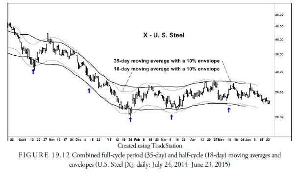 The next step is to draw a half-cycle centered moving average with an envelope, as shown in Figure 19.12. A half-cycle moving average in this example is 18 days. This moving average smoothes out all waves shorter than 18 days and includes waves 18 days or longer. When subtracted from the 35-day moving average, it reflects the waves that exist between 18 and 35 days, or the 35-day cycle we are investigating.