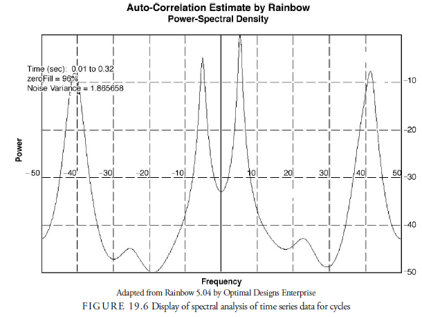 The most common and simplest method of wave analysis in a time series data is Fourier analysis. Fourier analysis, available in most mathematics software programs, has many variations. It has specific problems, however, in that it requires a large amount of data. For market forecasting, the more data that is involved, the more the waves can change and neutralize the calculations of parameters. Thus, Fourier analysis should be used only as a basic method of analyzing cycles in market time series data. A faster method, called Fast Fourier Transforms (FFTs), reduces the computation time of the analysis. A second problem with Fourier analysis is that it does not maintain the phase relationships between cycles. In other words, if one cycle crosses the horizontal axis after or before another, the difference in these phases is not recorded. This makes projection of the combination of the cycles difficult. Figure 19.6 displays an example of spectral analysis.