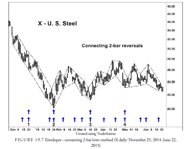 In many cases, the low points of dominant cycles in market data are obvious to the eye. The exact cyclical low can often be difficult to determine, but the general oscillation of the cycle is plain. In his book The Profit Magic of Stock Transaction Timing, Hurst, the father of cycle analysis in the stock market, used a method of envelopes that he traced along the major highs and lows in a price chart. These envelopes were not predetermined like a filter but were drawn freehand on the chart. When prices touched the upper and lower edges of the band, Hurst drew an arrow at the bottom of the price chart for later inspection. When he was done with the freehand estimates, he looked at the arrows drawn and determined if any obvious stable period separated the arrows. Rather than draw freehand, we prefer to connect 2-bar reversals (see Chapter 12); the results are about the same but more precise. Figure 19.7 shows what this method might look like.