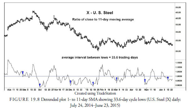 Figure 19.8 shows an example of this detrending method. The detrended line is constructed by dividing the current closing price by an 11-day, centered SMA. The cycle with a 33.6-day period (slightly shorter than the ideal 40 days) shows up clearly in the plot.