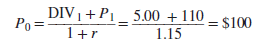 For Fledgling Electronics, DIV1 = 5 and P1 = 110. If r, the expected return for Fledgling is 15%, then today’s price should be $100: