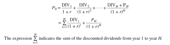 We have succeeded in relating today’s price to the forecasted dividends for two years (DIV1 and DIV2) plus the forecasted price at the end of the second year (P2). You will not be surprised to learn that we could go on to replace P2 by (DIV3 + P3)/(1 + r) and relate today’s price to the forecasted dividends for three years (DIV1, DIV2, and DIV3) plus the forecasted price at the end of the third year (P3). In fact, we can look as far out into the future as we like, removing Ps as we go. Let us call this final period H. This gives us a general stock price formula: