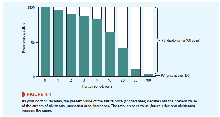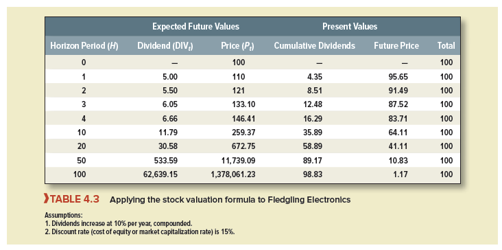 Table 4.3 continues the Fledgling Electronics example for various time horizons, assuming that the dividends are expected to increase at a steady 10% compound rate. The expected price Pt increases at the same rate each year. Each line in the table represents an application of our general formula for a different value of H. Figure 4.1 is a graph of the table. Each column shows the present value of the dividends up to the time horizon and the present value of the price at the horizon. As the horizon recedes, the dividend stream accounts for an increasing proportion of present value, but the total present value of dividends plus terminal price always equals $100.