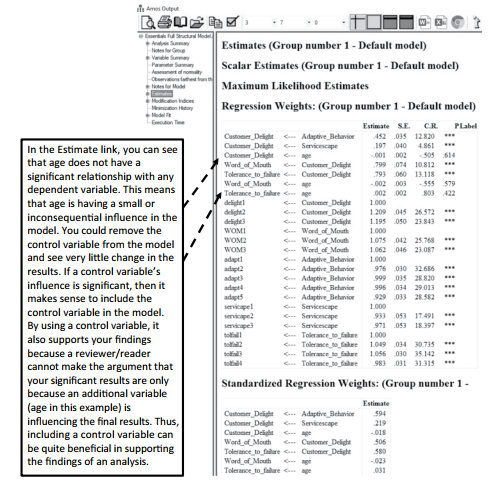 To include a control variable, you will drag that item from your variable list to the model window.You will then place a direct relationship from the control variable to each dependent variable in the model. You will also need to add a covariance relationship from the control variable to all the independent (exogenous) constructs in the model. In our full structural model example, let’s say that I needed to account for the “Age” of the respondent. The age of the customer might influence expectations of how the service should go and the likelihood of being delighted. I am going to include the “Age” observable variable in the model and add rela- tionships to all the dependent variables to control for the potential influence of this variable on the ultimate influence of the dependent variables.You can add as many control variables as you like as long as you think the variable might have an influence on a potential relationship in the model. See the example in AMOS of what it looks like with a control variable added to the model in Figure 5.21. After including the control variable, you can run the analysis. See Figure 5.22 for an example of the output.