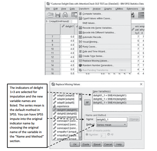 For clarity, I will show you how to perform all four approaches discussed in order to address missing data.To use a series mean imputation and linear interpolation imputation, this can be easily accomplished in SPSS (Figure 2.6). To replace missing values in SPSS, you need to go to the “Transform” option at the top and then select “Replace Missing Values”. Once you click “Replace Missing Values”, a pop-up window will appear where you will need to select which indicators have missing values and need to be imputed. When you select the indicators to impute, the default imputation is “series mean”, labeled as “SMEAN”. SPSS will impute the series mean for these indicators and create a new variable with an underscore and “1” as the new variable name. For instance, delight1 is renamed delight1_1 where all the missing values in this indicator are replaced with the series mean.