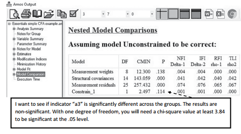 After running the analysis again, if we go to the results and click on the Model Comparison link, you will see the individual invariance tests for each factor loading.The test of all 8 factor loadings are presented at once so you can see exactly where your invariance problems lie in your model. In this instance, it appears that only a4 (WOM3) has a significant invariance test. All other factor loadings are invariant across the groups. Again, this is just another option in invariance testing.You can create one new constrained model and test each factor loading one by one, or you can create a constrained model for every factor loading at the beginning and see all the invariance tests at once.