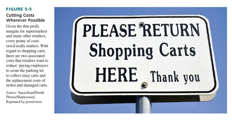 With a cost-containment approach, retailers strive to hold down both initial investments and operating costs. Many use this strategy due to intense competition from discounters, the need to control complicated chain or franchise operations, high land and construction costs, the volatility of the economy, and a desire to maximize productivity. The mature, highly saturated market; a slow-growth environment; competitive pressure to serve customers through multiple channels; and firms’ inability to raise prices make it imperative for retailers to drive down costs. They must examine every aspect of their businesses to streamline processes and costs. See Figure 5-5.