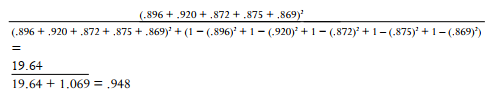 I have discussed earlier that reliability of indicators can be explored by calculating Cronbach’s alpha, but this test has had its detractors. Yang and Green (2011) has noted that Cronbach’s alpha is known to overestimate and underestimate values and is “not to be construed as a coef- ficient of internal consistency but rather an estimate of reliability based on the internal con- sistency of items” (p. 389). In the face of this criticism, a test called “composite reliability” has been offered as a better alternative to Cronbach’s alpha, especially when using SEM (Hair et al.2009). This reliability test is calculated based on the factor loadings of indicators obtained from a confirmatory factor analysis. The only downside to this test is that AMOS does not calculate composite reliability and so you have to calculate it by hand (or, if you are savvy enough, design a script to calculate it). To calculate composite reliability, you need the standardized factor loadings of each construct. Here is how to calculate a composite reli- ability for each construct: