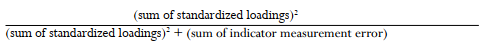 I have discussed earlier that reliability of indicators can be explored by calculating Cronbach’s alpha, but this test has had its detractors. Yang and Green (2011) has noted that Cronbach’s alpha is known to overestimate and underestimate values and is “not to be construed as a coef- ficient of internal consistency but rather an estimate of reliability based on the internal con- sistency of items” (p. 389). In the face of this criticism, a test called “composite reliability” has been offered as a better alternative to Cronbach’s alpha, especially when using SEM (Hair et al.2009). This reliability test is calculated based on the factor loadings of indicators obtained from a confirmatory factor analysis. The only downside to this test is that AMOS does not calculate composite reliability and so you have to calculate it by hand (or, if you are savvy enough, design a script to calculate it). To calculate composite reliability, you need the standardized factor loadings of each construct. Here is how to calculate a composite reli- ability for each construct: