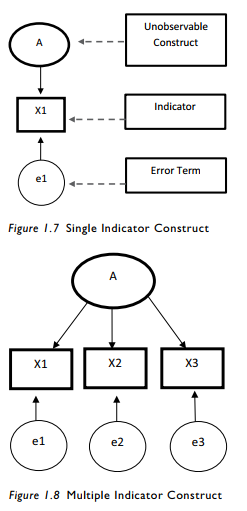 Multiple Indicators—more than one observed item is used to capture the construct. In the example shown in Figure 1.8, the unobserv- able construct “A” is being captured or measured by three indicators (X1–X3). The rationale is that complex constructs cannot be fully captured with- out multiple indicators. As well, multiple indicators aid the researcher in understanding the reliability and validity of the captured unobserved variable. Lastly, you can determine the measurement error of each indicator, giving you a better understanding of whether your indicators/items are capturing the unobservable concept.