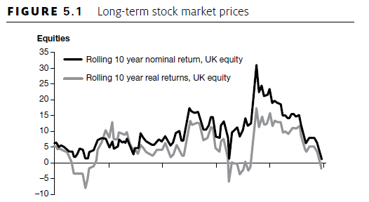 Another criterion might be the sort of reward you would need for the admitted risks of investing in shares. Both sides of that equation are subjective – risks vary with the timescale, the choice of investments and the range of holdings; rewards need to be compared with the return from alternative uses of the money such as putting the cash on deposit, into gilts, or into other investments such as property, art and so on. Returns on equities (another term for shares) are usually several percentage points higher than on gilts, which in turn are several points above deposit accounts, but what the real return will be in the future is only an extrapolation – history shows that both absolute and relative values change.