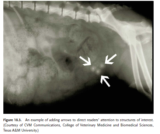 If you can’t crop down to the features of special interest, consider superimposing arrows or letters on the photographs, as shown in Figure 18.3. In this way, you can draw the reader’s attention to the significant features. Having arrows or letters to refer to can aid in writing clear, concise legends.