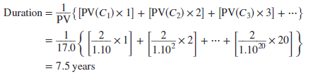 Therefore, to hedge its interest rate risk, Potterton needs to issue a package of bonds with a duration of 7.5 years. The simplest solution is to issue a 12-year bond with a 10% coupon, which has a 7.5-year duration. But this is not the only possible strategy. For example, the company could issue $7.9 million of 10% 20-year bonds and $9.1 million of 10% 8-year bonds. The duration of this package would also be 7.5 years.[2]
