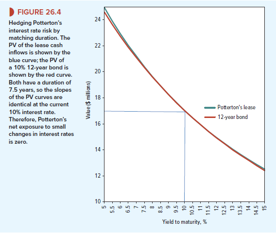 Now compare the slope of the PV curve for the lease payments with the slope of the 12-year bond. The slopes are identical at the current 10% interest rate because the duration is identical at this rate. Therefore, so long as the interest rate does not stray too far from the current level of 10%, the PV of the lease cash flows change by almost the same amount as the PV of the bond. In this case, Potterton is hedged. But you can see from Figure 26.4 that if interest rates change by, say, 5%, the value of the lease payments changes by a little bit more than the value of the bond. In this case, Potterton’s CFO will have to reset the hedge.
