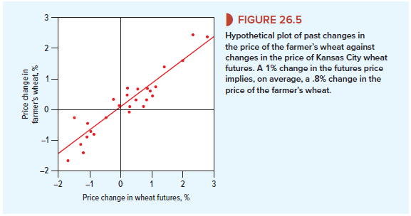 Figure 26.5 shows how changes in the prices of the two types of wheat may have been related in the past. The slope of the fitted line shows that a 1% change in the price of Kansas wheat was, on average, associated with an .8% change in the price of the farmer’s wheat. Because the price of the farmer’s wheat is relatively insensitive to changes in Kansas prices, he needs to sell .8 X 100,000 bushels of wheat futures to minimize risk.