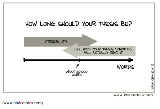 A Ph.D. thesis in the sciences is supposed to present the candidate’s original research. Its purpose is to prove that the candidate can do and communicate such research. Therefore, a thesis should exhibit the same type of disciplined writing that is required in a journal publication. Unlike a scientific paper, a thesis may address more than one topic, and it may present more than one approach to some topics. The thesis may present all or most of the data obtained in the student’s thesis-related research. Therefore, the thesis usually is longer and more involved than a scientific paper. But the concept that a thesis must be a bulky 200-page tome is wrong, dead wrong. Many 200-page theses contain only 50 pages of good science. The other 150 pages comprise turgid descriptions of insignificant details.