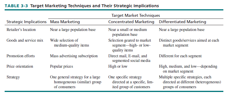 The customer group sought by a retailer is called the target market. In selecting its target market, a firm may use one of three techniques: mass marketing, selling goods and services to a broad spectrum of consumers; concentrated marketing, zeroing in on one specific group; or differentiated marketing, aiming at two or more distinct consumer groups, with different retailing approaches for each group.