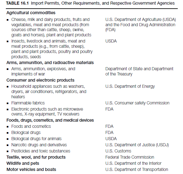Even though most goods freely enter the United States, there are some restrictions on the importation of certain articles (see International Perspectives 16.1 and 16.2 and Table 16.1). The rules prohibit or limit the entry of some imports; limit entry to certain ports; or restrict routing, storage, or use or require treatment, labeling; or processing as a condition of release from customs. U.S. nontariff barriers fall into the following categories (U.S. Department of Commerce, 2003):