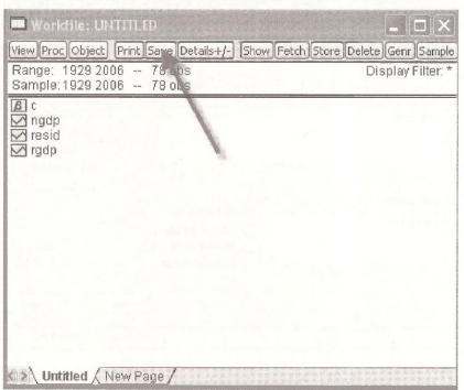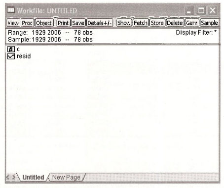 To create the workfile for annual data covering sample period 1929 to 2006, select Annual from the drop-down menu in Frequency and type in the Start and End dates. Clicking on OK will create the UNTITLED workfile below.