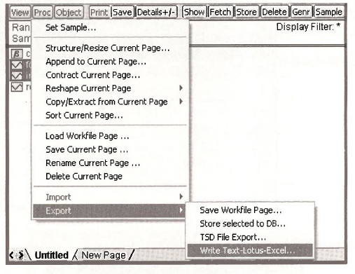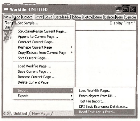 There are times when you would like to export data from an EViews workfile. To illustrate, let us work with food.wfl and export the two series. To do so, highlight the two series then click on Proc/Export/Write Test-Lotus-Excel.