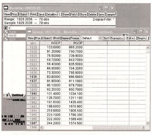 Clicking on OK will import the data from the Excel datafile to the EViews workfile. As a check open the group NGDP and RGDP and you can see that we have successfully imported the data (do check this against the Excel spreadsheet shown above).