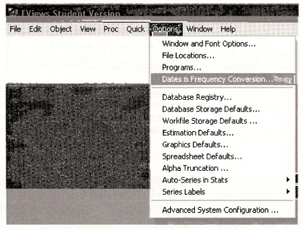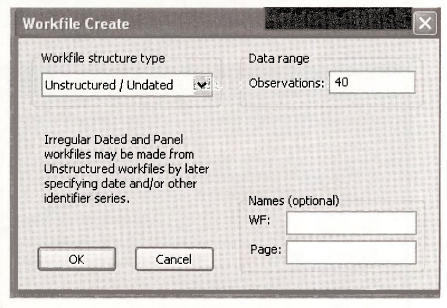 To create an EViews workfile, double click on your EViews icon to open the software, then select File/New/Workfile. The following screen will open up.