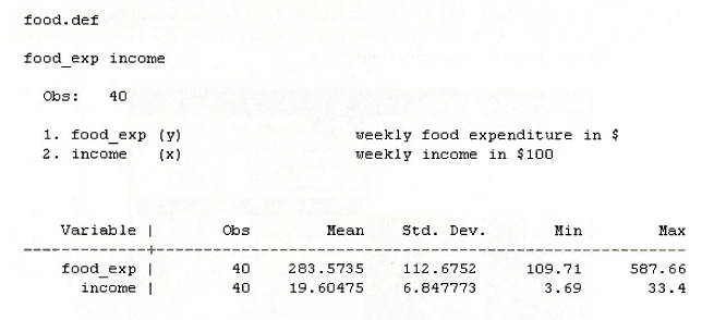 This definition file shows that there are 40 observations on two variables, Y and X, in that order, and they are weekly food expenditure and weekly income, respectively.