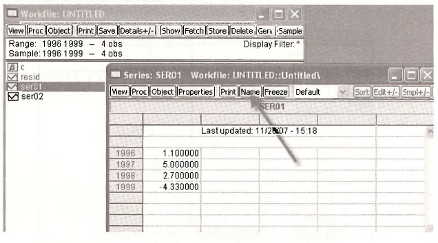 As you fill in the data, EViews will assign temporary names, SER01 and SER02, to the variables. To change those names, for example, to change SER01 to X, click open SER01, and select name: