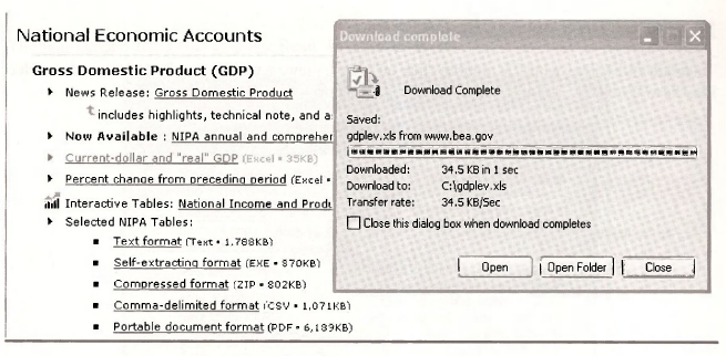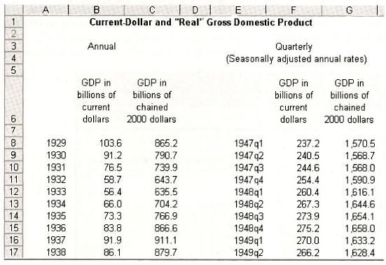Once the file has been downloaded (in this example, to C:\gdplev.xls), we can open the file and a sample of the data in Excel format is shown below.