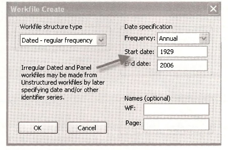 For illustrative purposes, let us now import the annual data (1929-2006) for nominal GDP (column B, first observation in cell B8) and real GDP (column C, first observation in cell C8) into an EViews workfile.