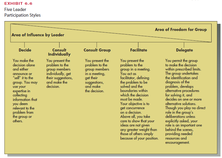 Leader Participation Styles. The model employs five levels of subordinate participation in decision making, ranging from highly autocratic (leader decides alone) to highly democratic (leader delegates to group), as illustrated in Exhibit 6.6.52 The exhibit shows five decision styles, starting with the leader making the decision alone (Decide);
